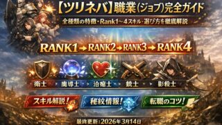 【ツリネバ】職業(ジョブ)完全ガイド|全種類の特徴・Rank1〜4スキル・選び方を徹底解説最終更新:2026年3月14日「どの職業を選べばいいか迷っている」「Rank2・3・4に転職するとどう変わるの?」——この記事ではそんな疑問をすべて解...