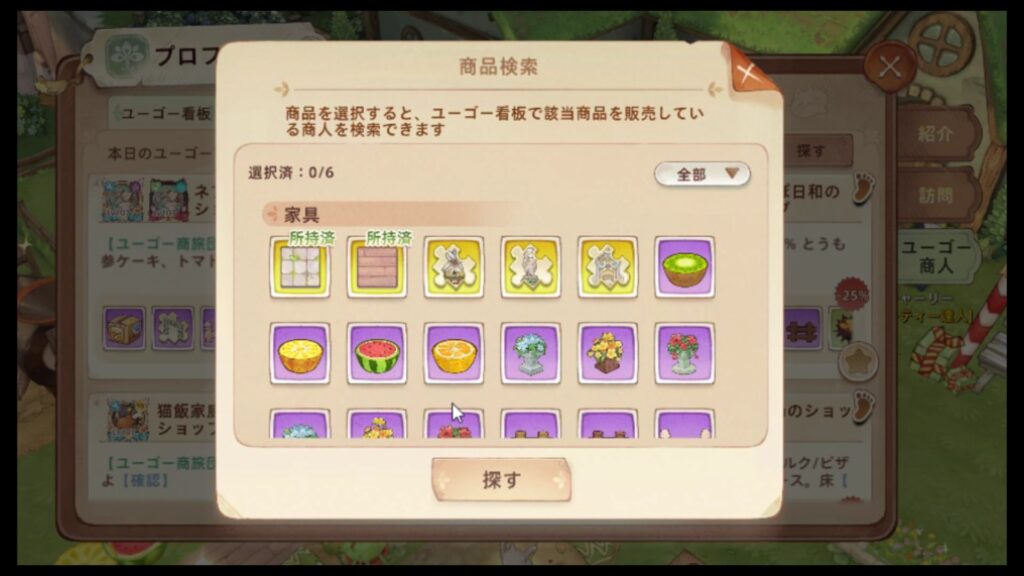検索後、「探す」を押すと、該当アイテムを所持しているプレイヤーが表示されます。