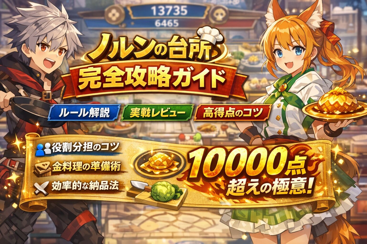 今回はイベントコンテンツ「ノルンの台所」について、基本ルールの解説から実際のプレイ動画をもとにした立ち回り、スコアの伸ばし方、報酬内容までまとめて詳しく解説していきます。