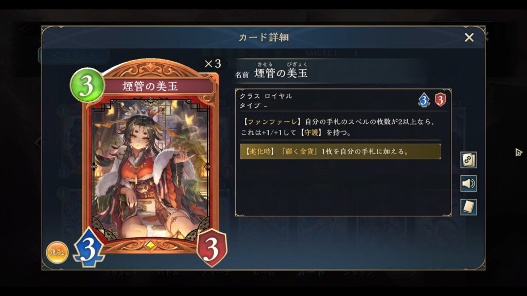 このデッキは煙管の美王を軸に序盤から盤面の主導権を握り、そのまま疾走でリーサルまで持っていく構成です。