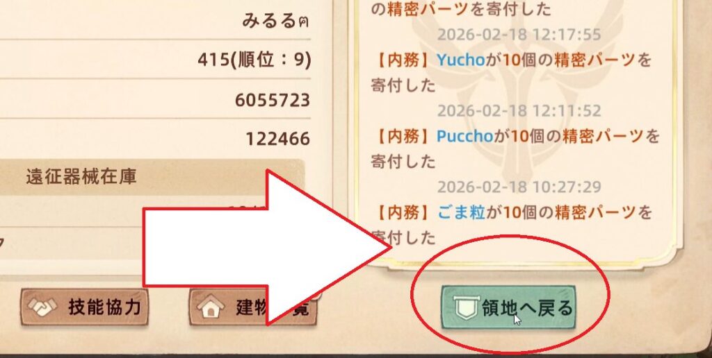 建物一覧で「助力」が出ている施設に移動し、助力ボタンを押します。