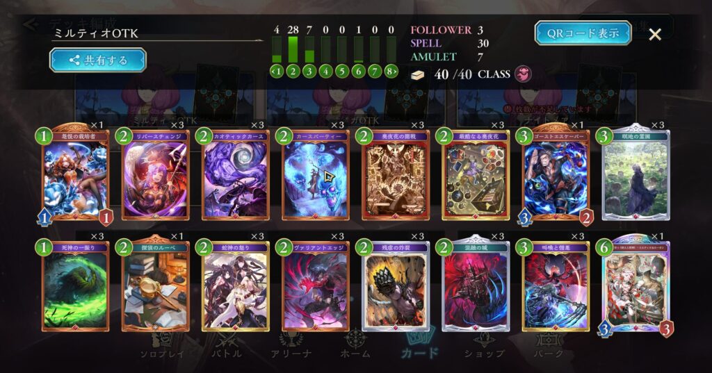 フォロワーわずか3枚、スペル30枚という極端な構成ですが、その分コンボ到達率を最大限まで高めた理論構築になっています。