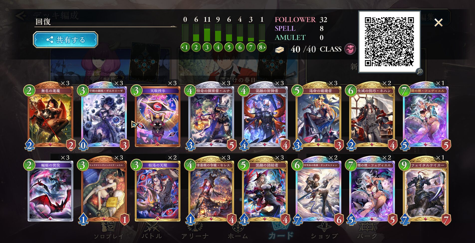 まずはデッキレシピから。2コスト帯を絞り、回復と除去を両立できるカードをたっぷり採用しています。