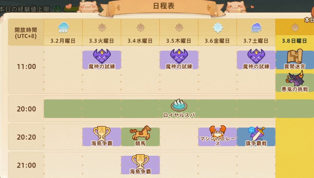 これだけ見ると、そこまで重すぎるゲームではありません。毎日数時間拘束されるタイプではないので、社会人や学生でも触りやすい方だと思います。ただし、問題は単純な所要時間ではなく、時間指定コンテンツの多さです。