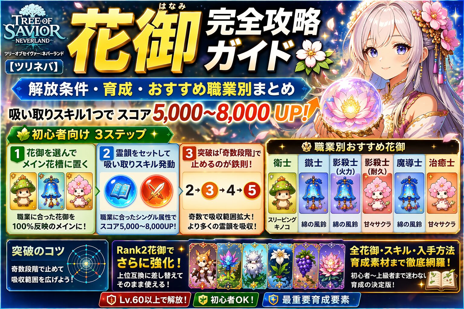 この記事では、ツリーオブセイヴァーネバーランド(ツリネバ)の育成システム「花御(はなみ)」について、解放条件から花槽・霊韻の仕組み、職業別のおすすめ構成、育成の優先順位まで徹底的に解説します。花御はLv.60以降の戦力強化において最重要の要素のひとつで、吸い取りスキルを1つ発動させるだけでもスコアが5,000〜8,000上昇するため、正しく運用するかどうかでキャラクターの総合力が大きく変わります。序盤はどの花御をメインに据えるべきか、突破はどの段階で止めるべきか、Rank2花御にはいつ移行すべきか――こうした疑問にすべて答える構成になっています。通常花御からRank2花御まで全種類のスキル・コア属性・入手方法も網羅しているため、育成中に迷ったときの辞書としても活用できます。初心者から中・上級者まで参考にできる内容ですので、ぜひ育成の指針としてお役立てください。