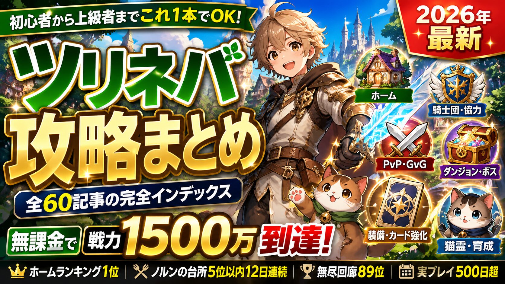 Meta description(140字以内・SEO用) 無課金で戦力1500万到達・ホームランキング1位・ノルンの台所5位を12日連続キープ。実プレイ500日超のにゃんたんが書いたツリネバ攻略記事62本を「日課・育成・ホーム・騎士団・イベント」まで目的別に整理。110レベル解放・幻果・翠語幻境・海島遠征など最新アプデにも対応。